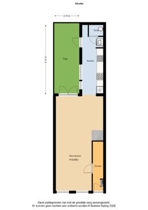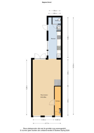 Begane grond; entree, hal met ruimte om de fiets te stallen, woonkamer vv een laminaatvloer en openslaande deuren naar de tuin, aangebouwde moderne keuken vv een kookplaat, afzuigkap, koel/vriescombinatie en een oven, toilet.