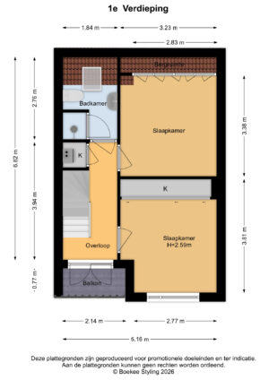 1e etage: overloop, berging met de cv-ketel, balkon, badkamer met 2e toilet, douche en wastafelmeubel, ruime slaapkamer aan de achterzijde met opbergruimte en slaapkamer aan de voorzijde met vaste kasten.